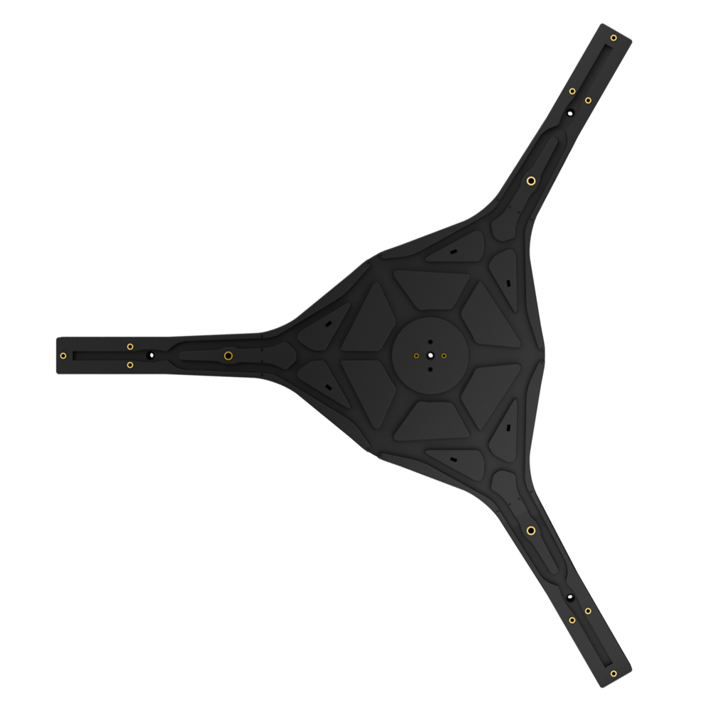 Schraube die 3 Verbindungsteile am Basisteil fest. Dafür brauchst du 6× 40 mm M4-Schrauben und 6× M4-Muttern (jeweils 2 pro Verbindungsteil). Diese verbinden das Mittelteil mit den äußeren Segmenten und bilden die Gesamtstruktur der Grundplatte.