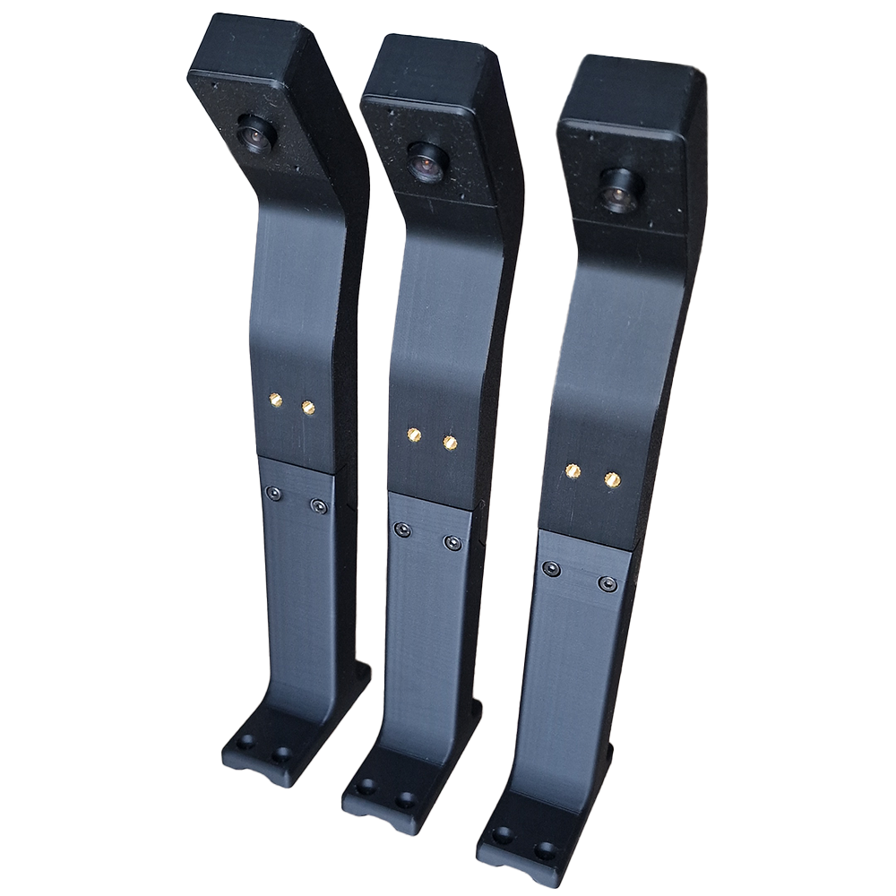Zuerst das Kabel von unten durch den Standfuß schieben, dann von unten durch den Kameraarm. Danach Arme und Füße aufeinanderstecken und mit den 6× 20 mm M4-Schrauben und 6× M4-Muttern verschrauben (2 Schrauben und 2 Muttern pro Arm) – so sitzen Kabel und Teile korrekt.